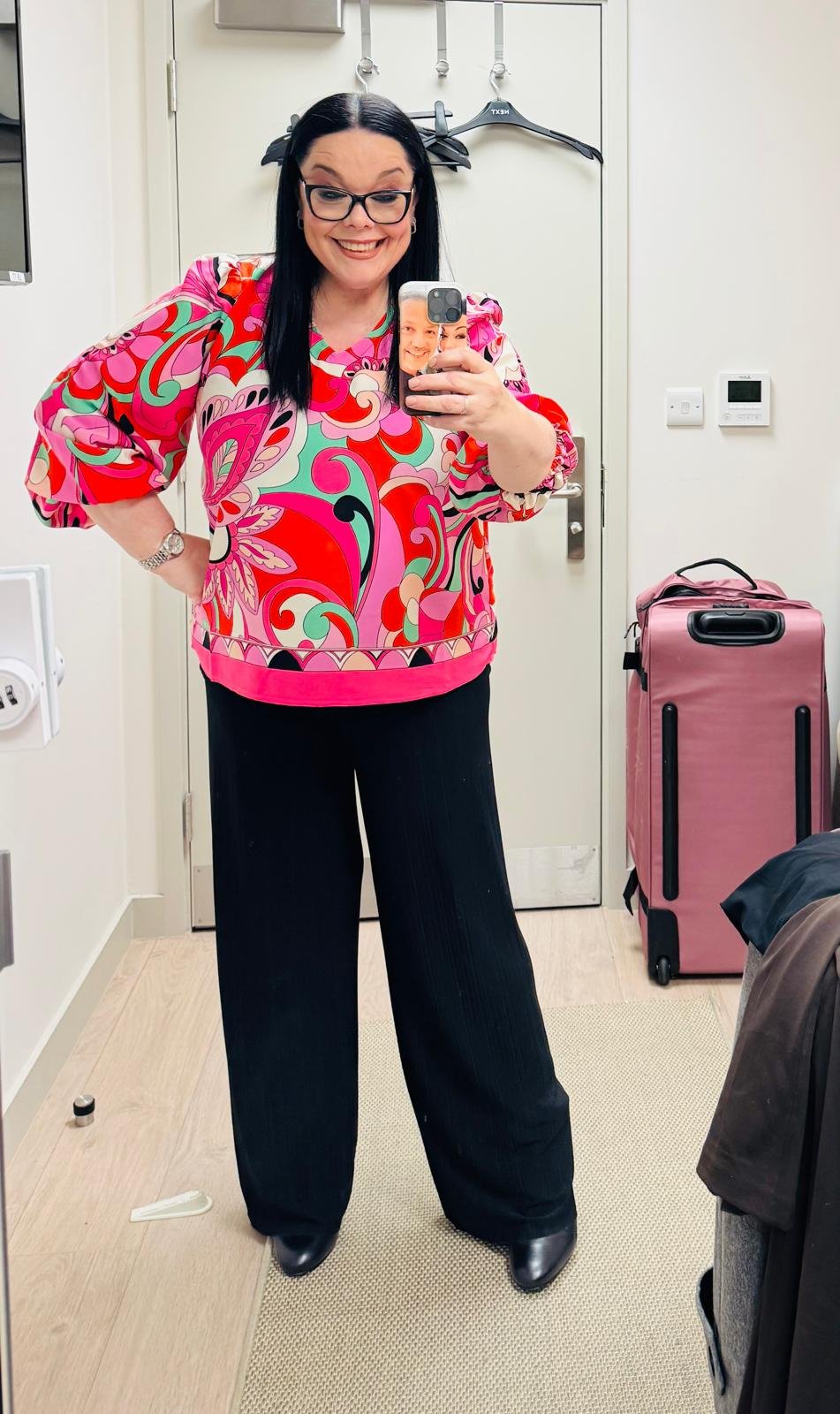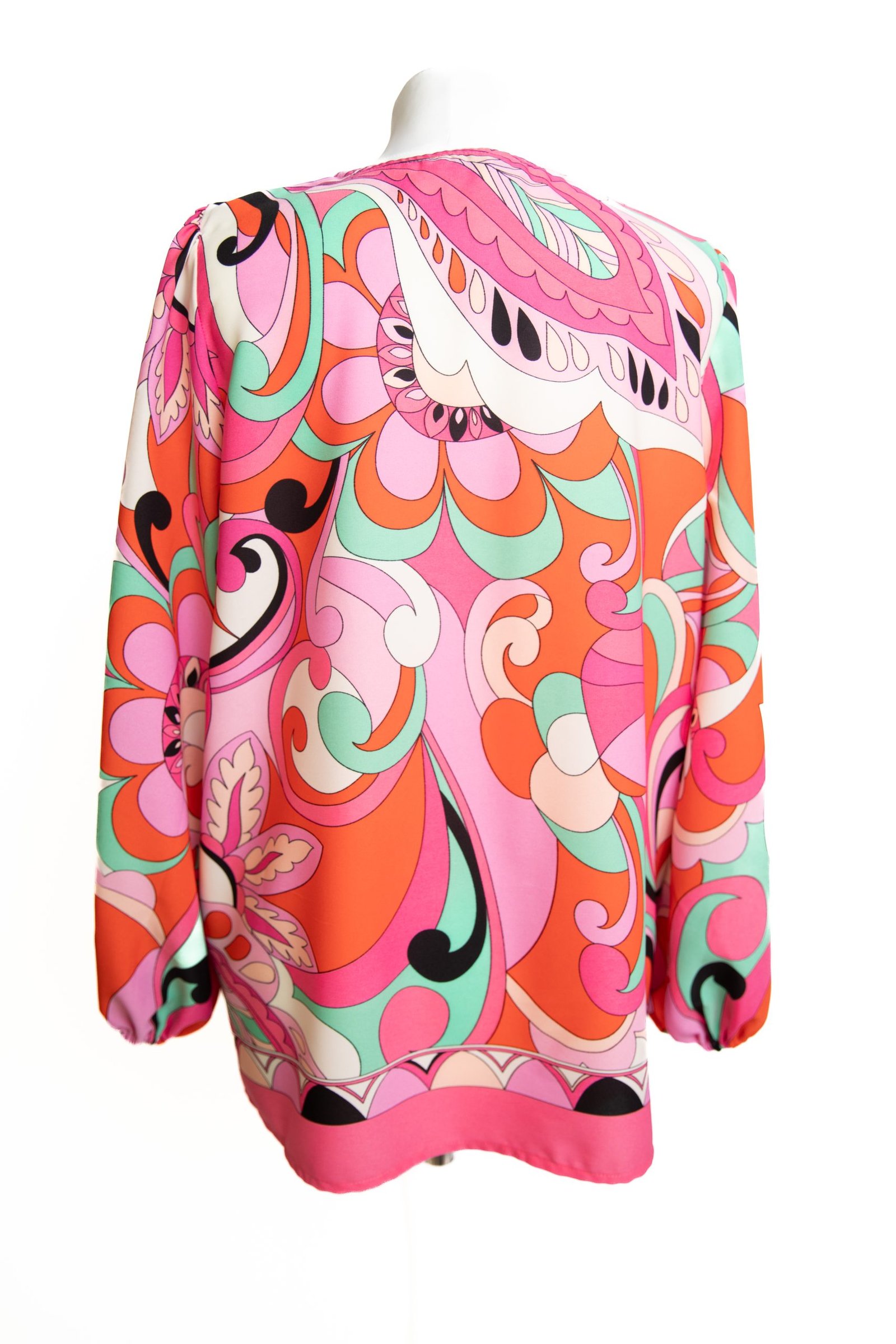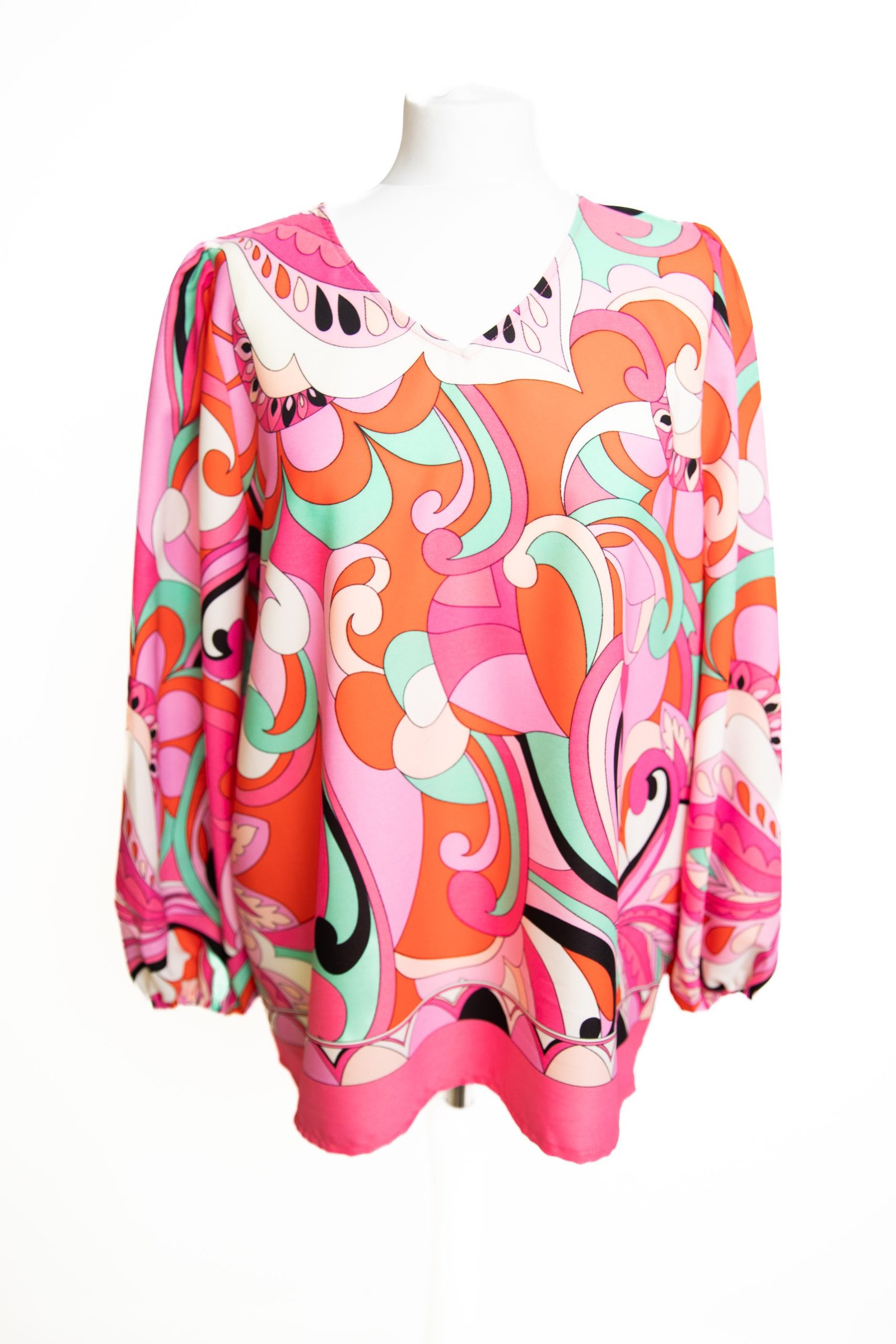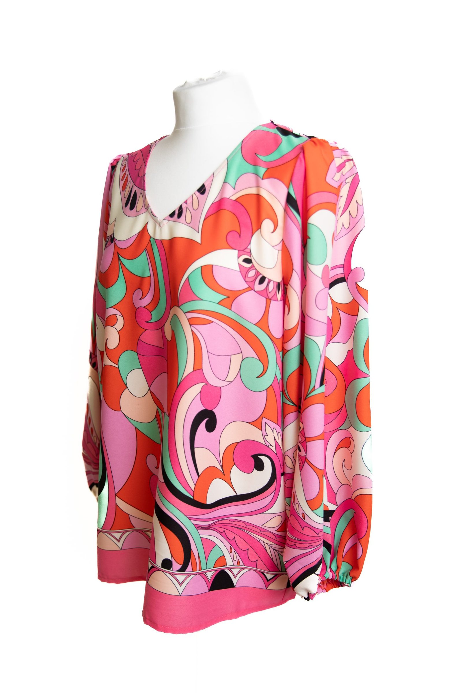 A stunning pink multi patterned v neck top with voluminous sleeves and elasticated cuffs.