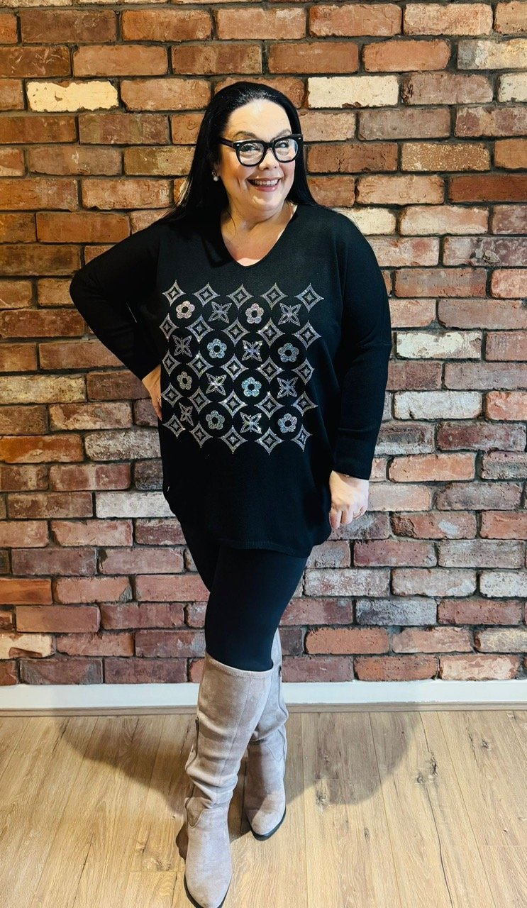 V NECK KNITTED JUMPER / TUNIC WITH FLOWER BLING DESIGN – one size – size 10 – 20