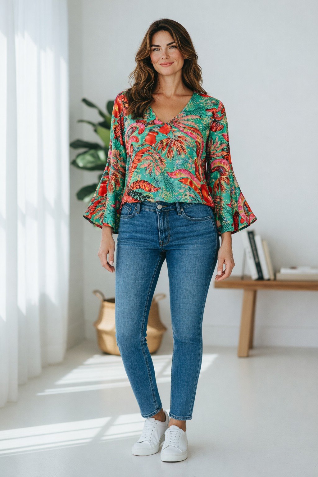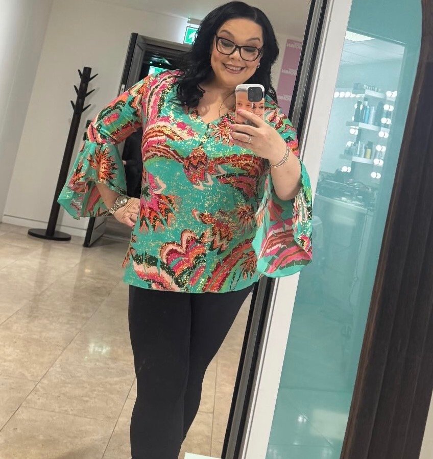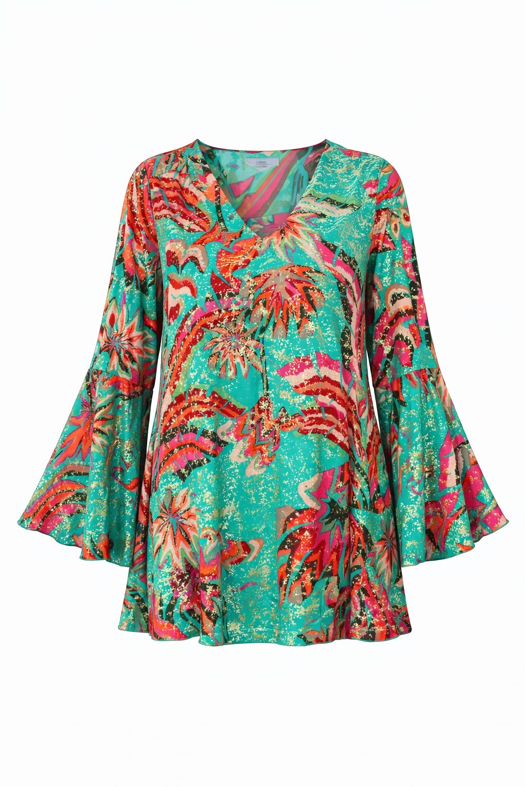 ‘L’ V Neck Floaty Sleeve Printed Top – one size 10 – 18
