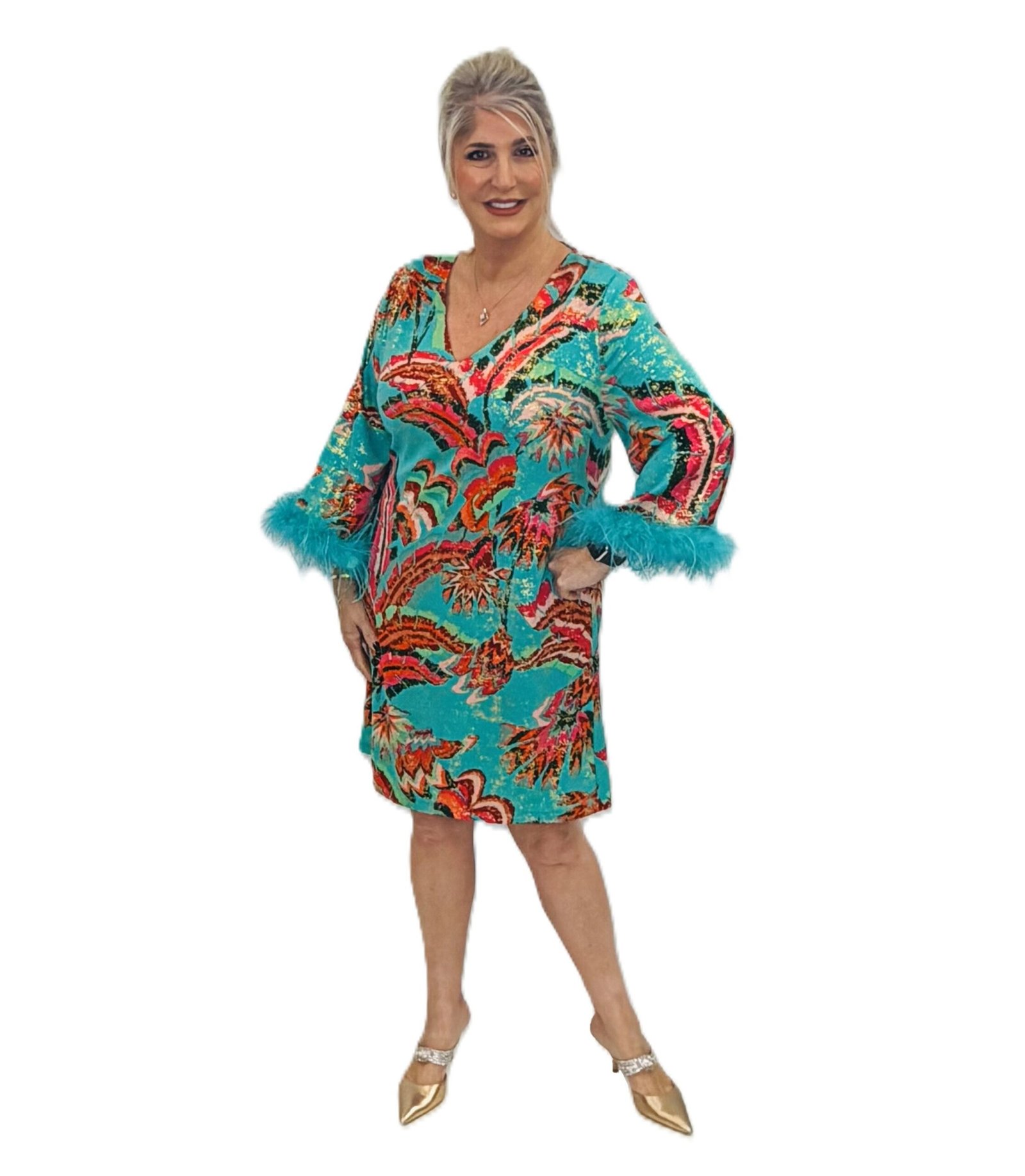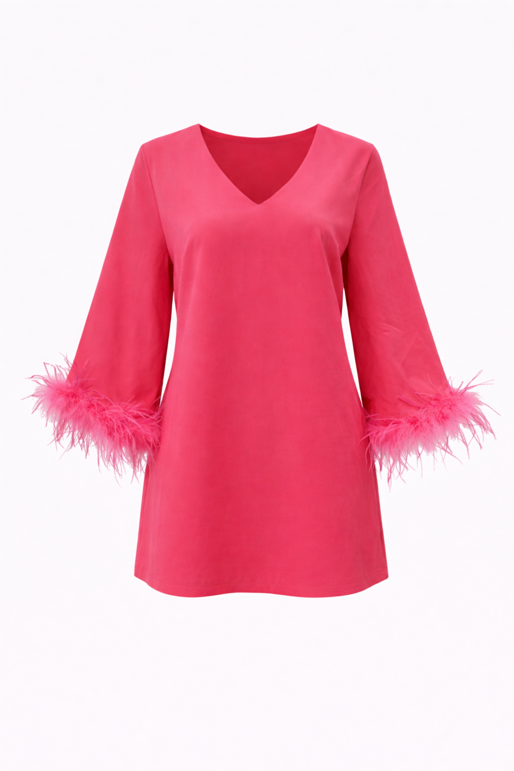 BELL SLEEVE DRESS WITH DETACHABLE MARABOU FEATHER CUFFS