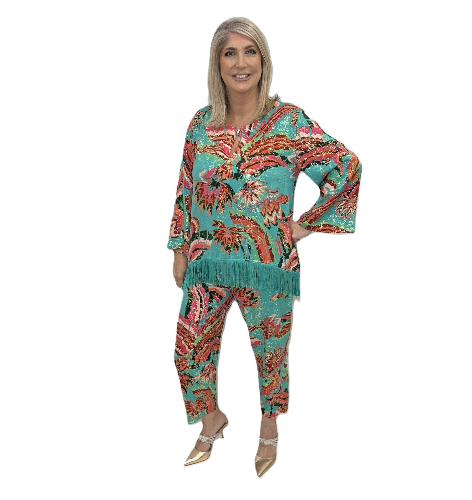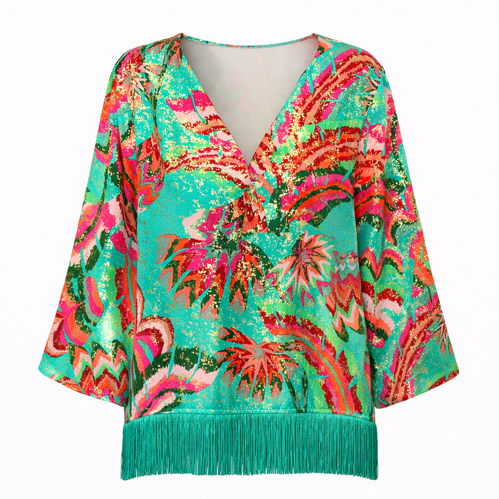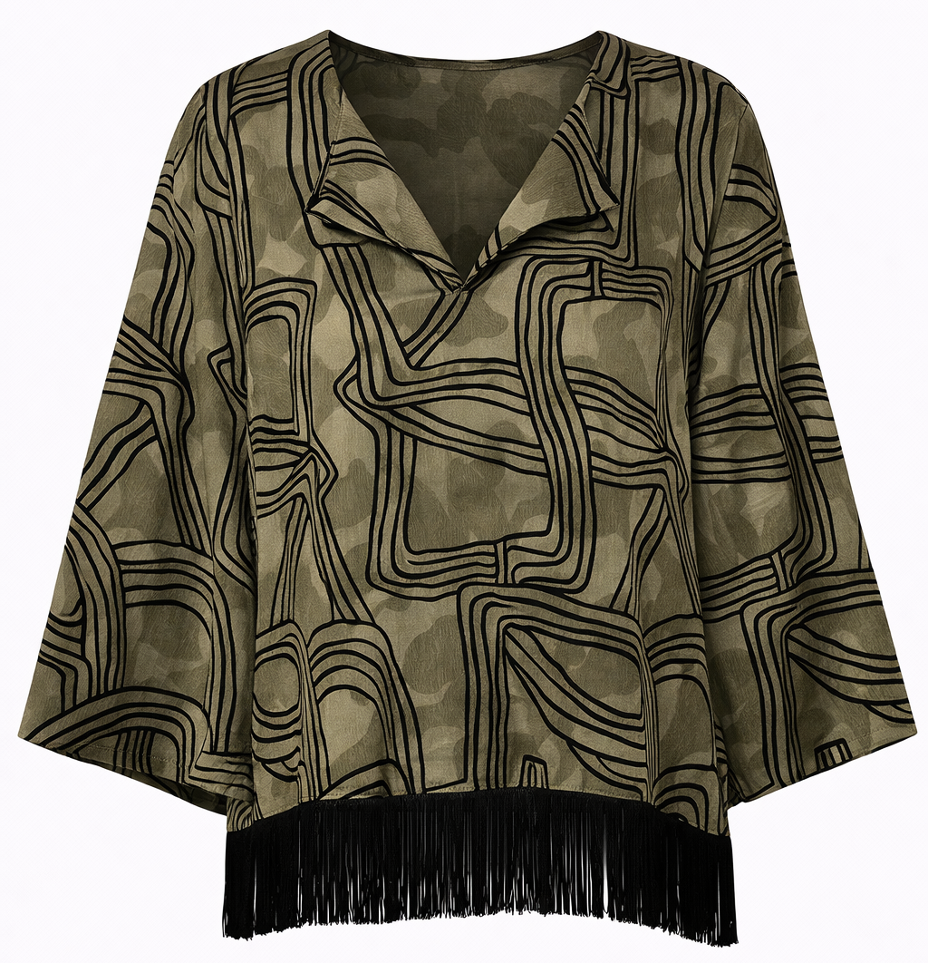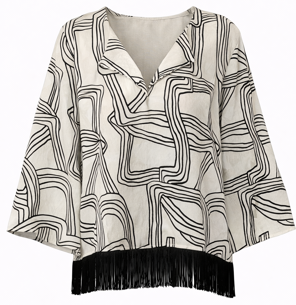 DIPPED BACK WOVEN TOP WITH FLARED SLEEVES AND TASSEL TRIM HEM