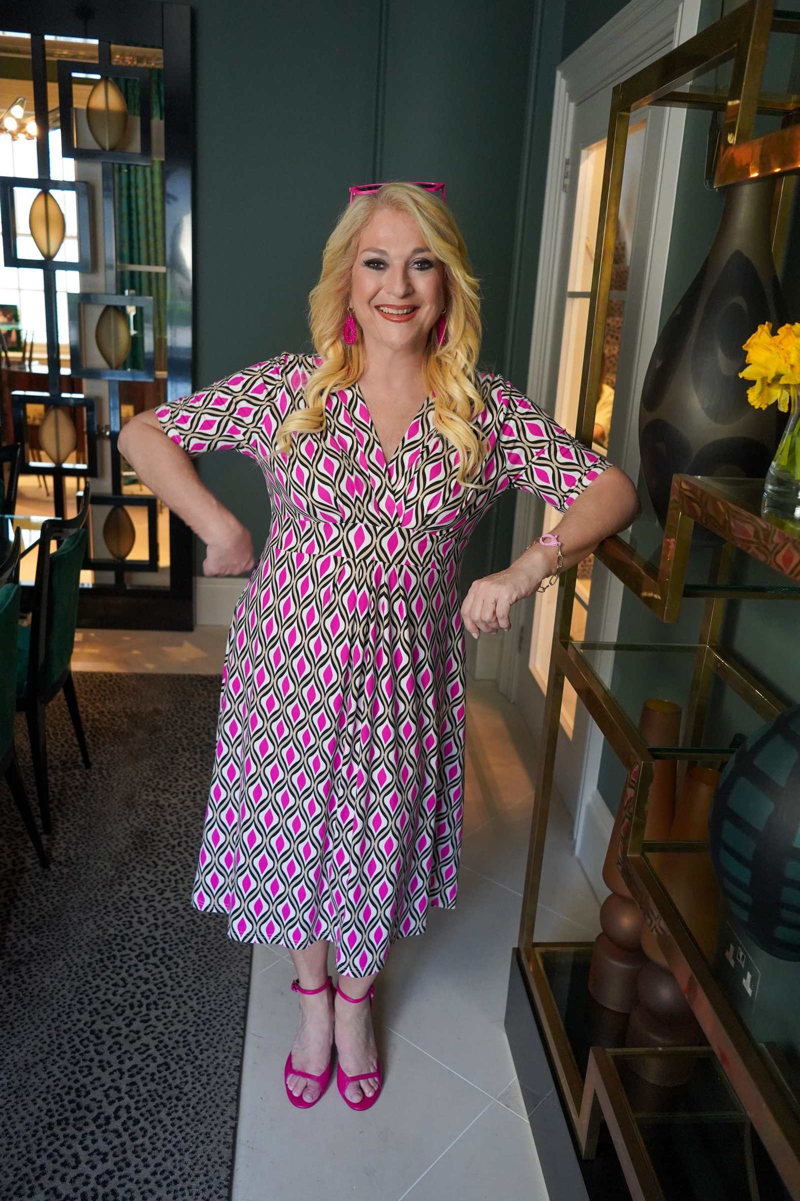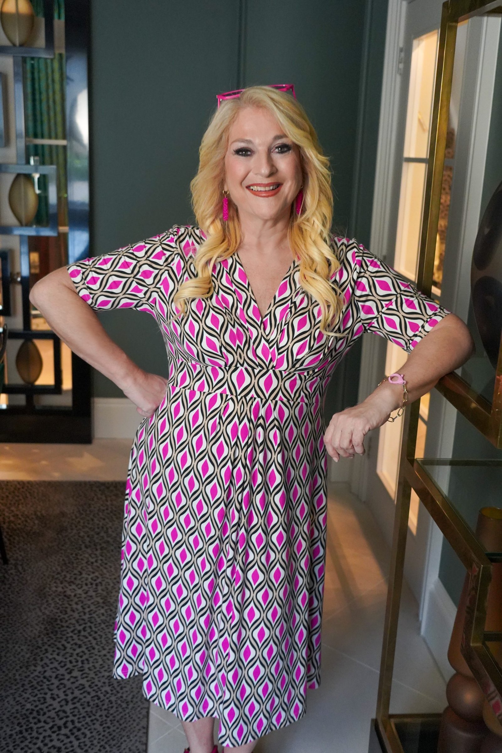 Introducing The Mavis. A versatile and stylish pink short sleeve dress made from soft jersey fabric. This dress features a feminine pleated V-neck front, adding a touch of elegance and sophistication. The flattering elbow-length sleeve provides coverage and comfort. Whether you’re attending a casual gathering or a formal event, this dress is perfect for all occasions. Embrace your personal style and make a statement with this beautiful and versatile dress.