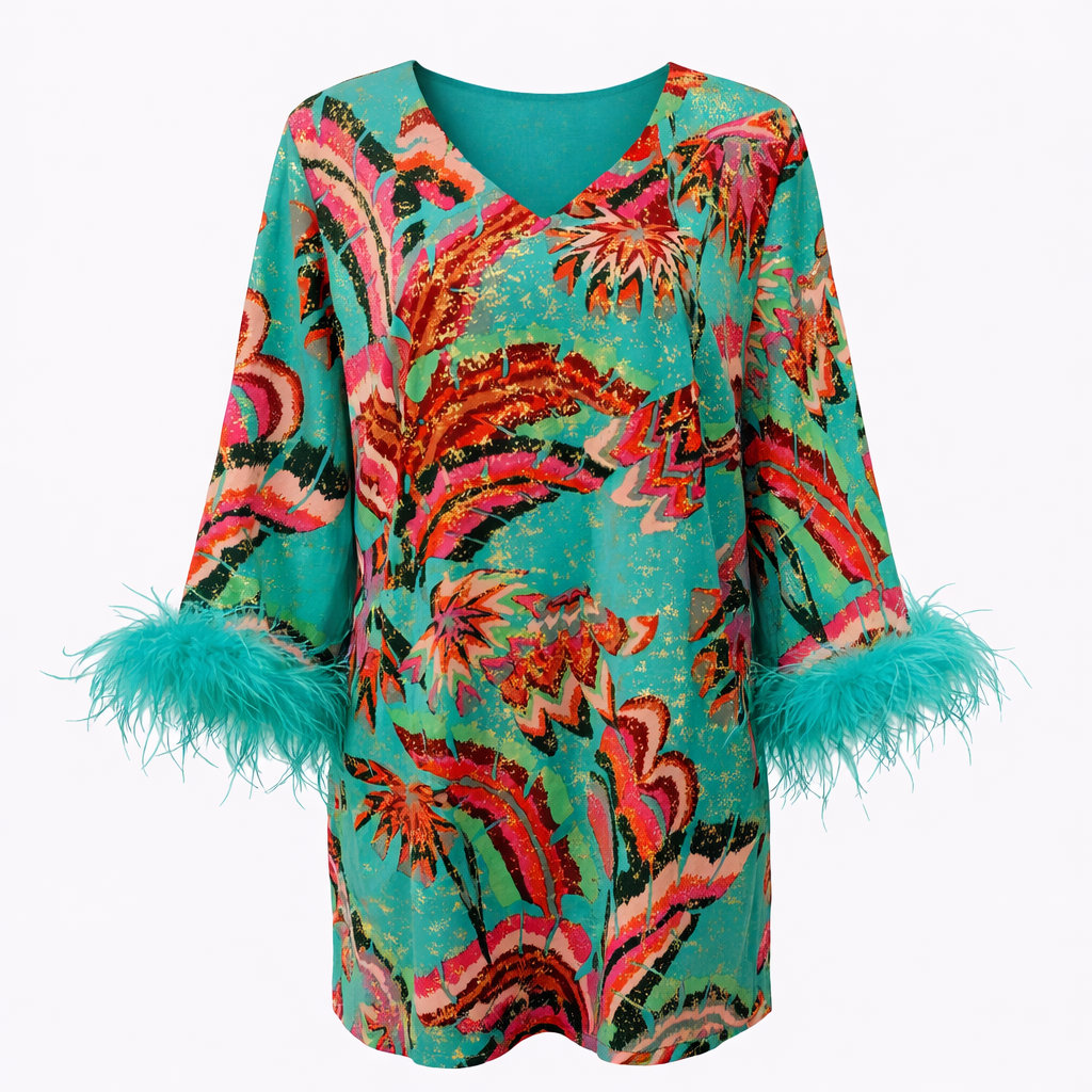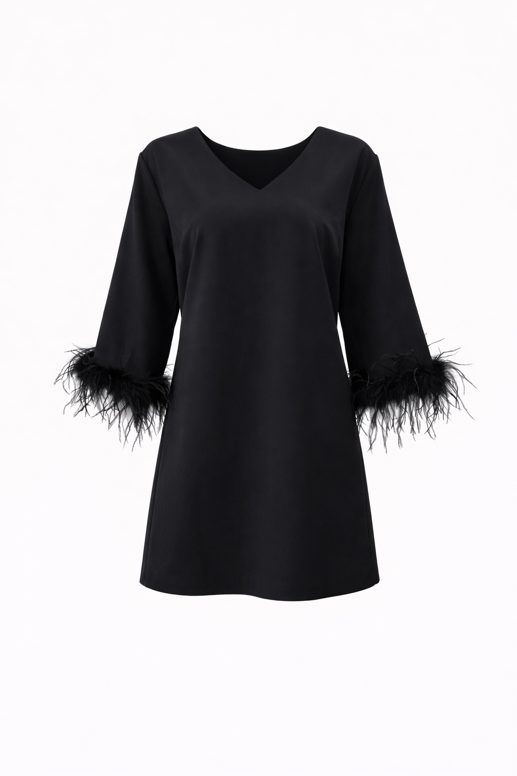 BELL SLEEVE DRESS WITH DETACHABLE MARABOU FEATHER CUFFS