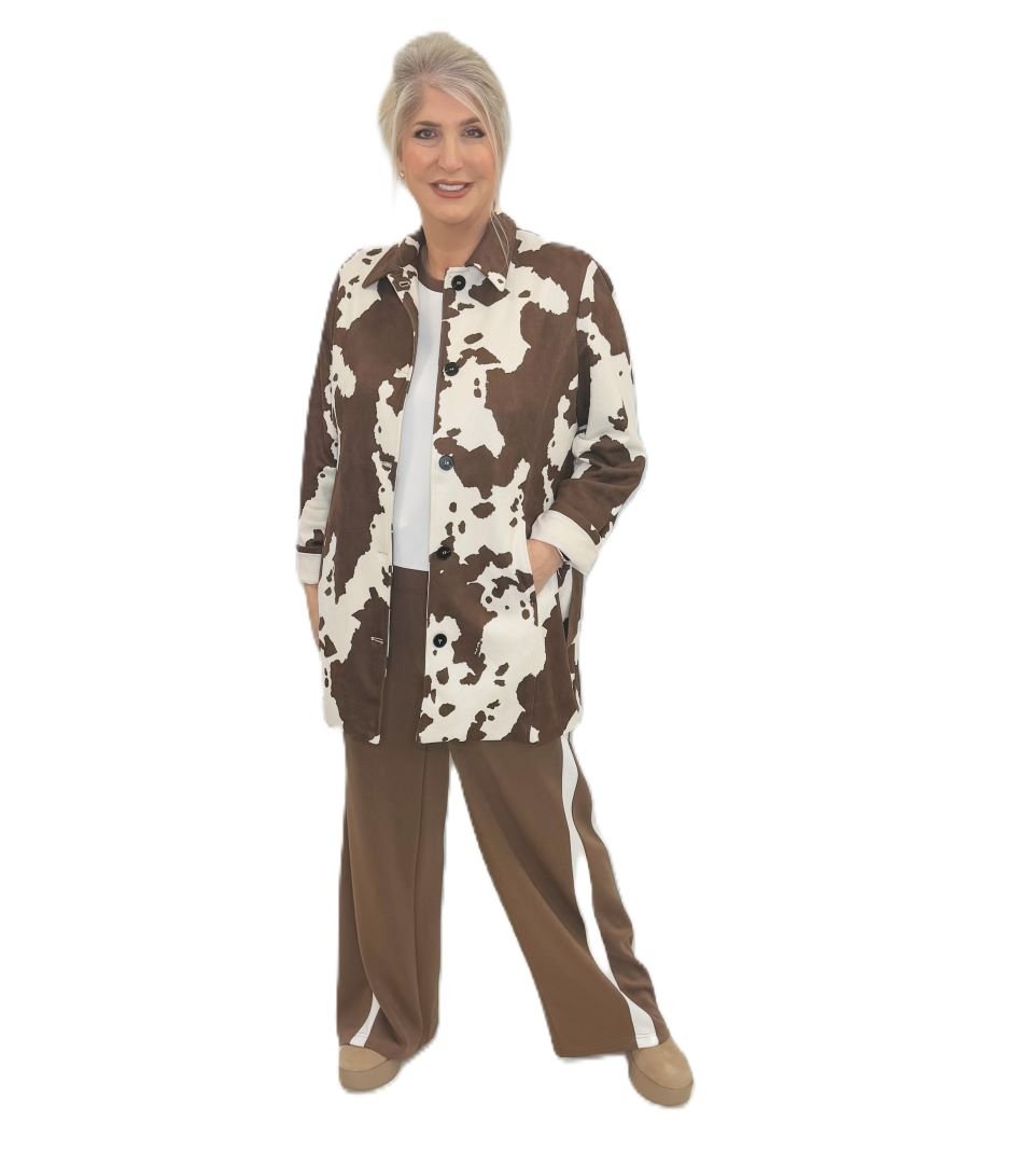 COW PRINT MOCK SUEDE BUTTON THROUGH JACKET WITH BELT