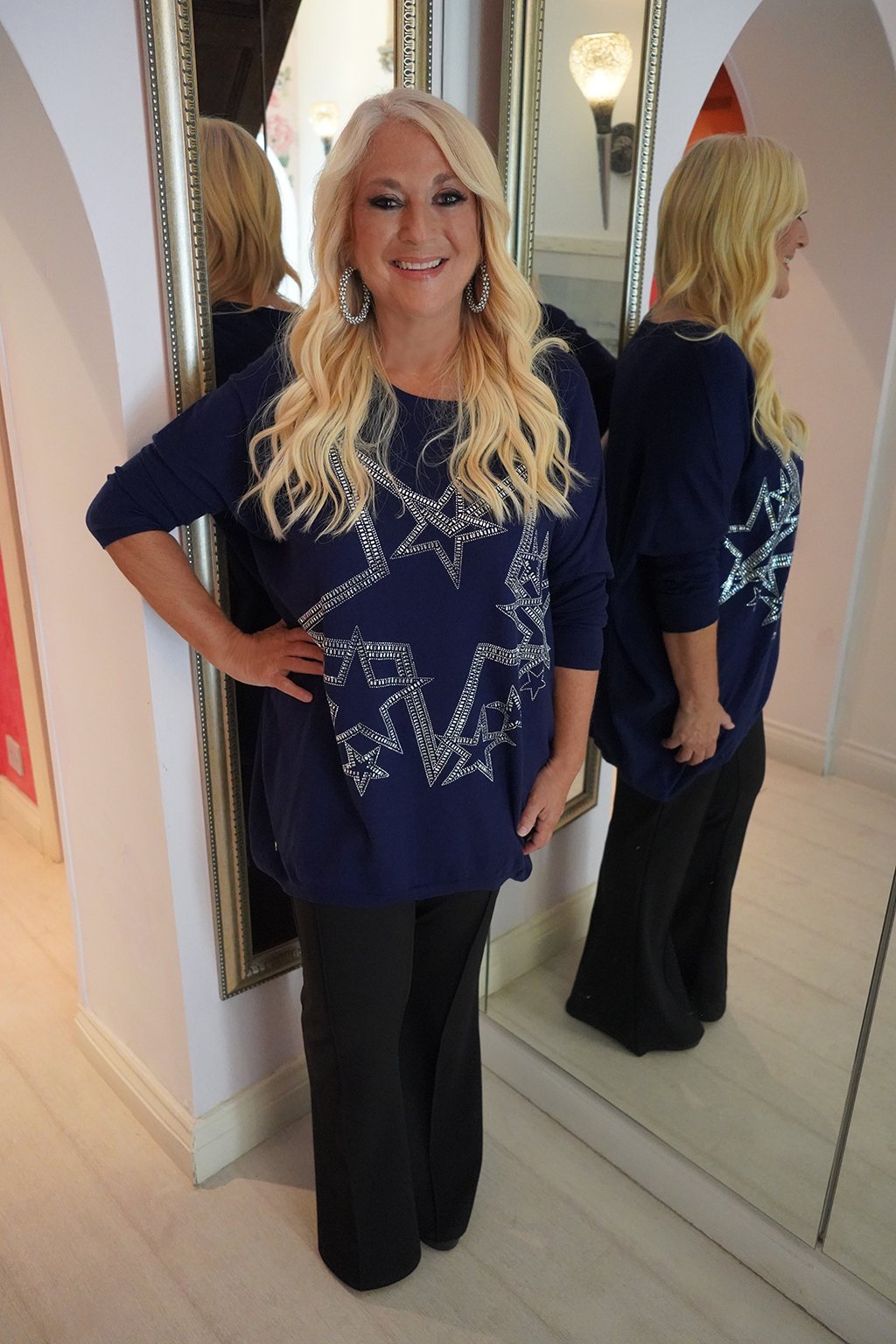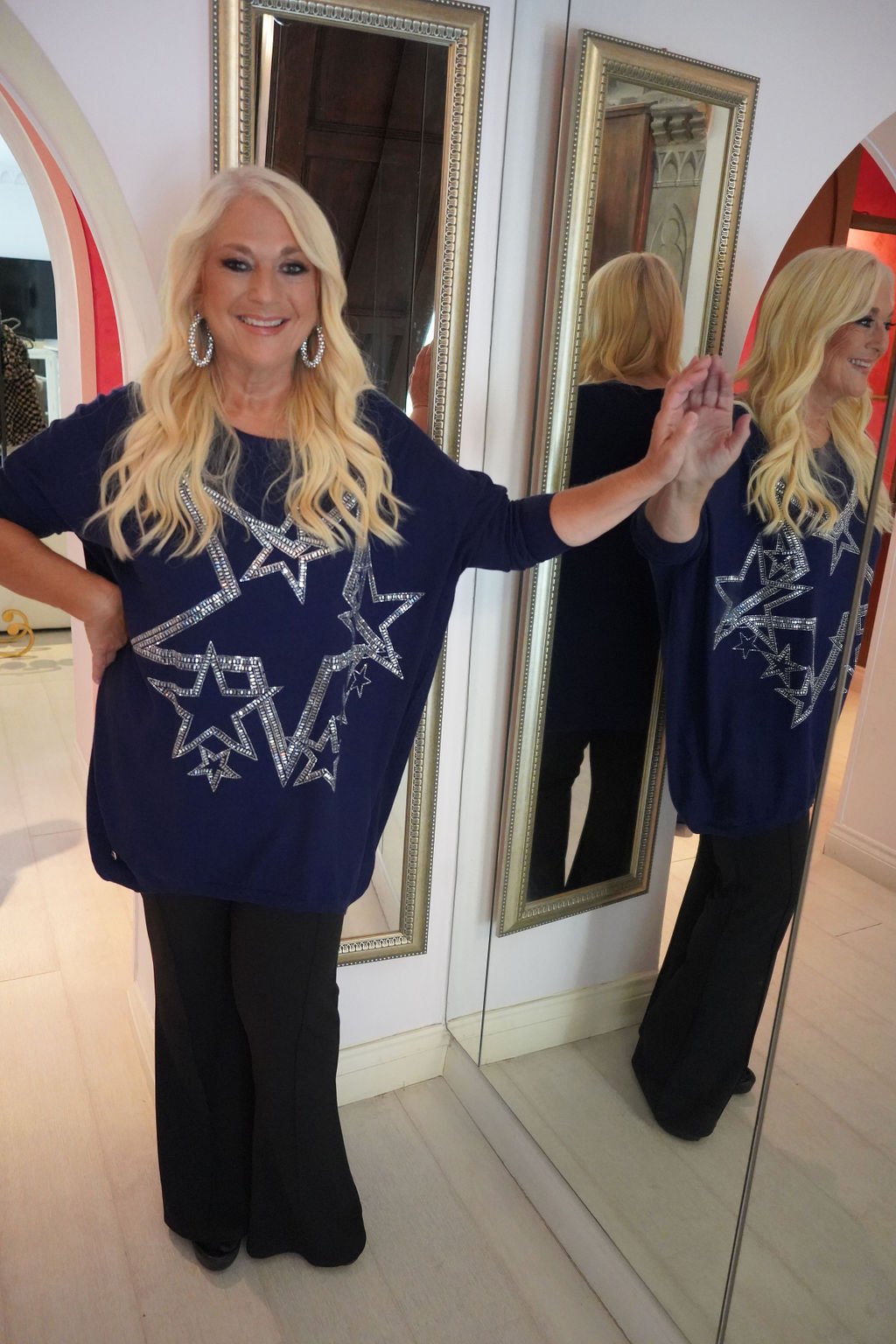 This show stopping jumper with a glittering star motif ,will enhance any wardrobe. Day to night , a top for all occasions.