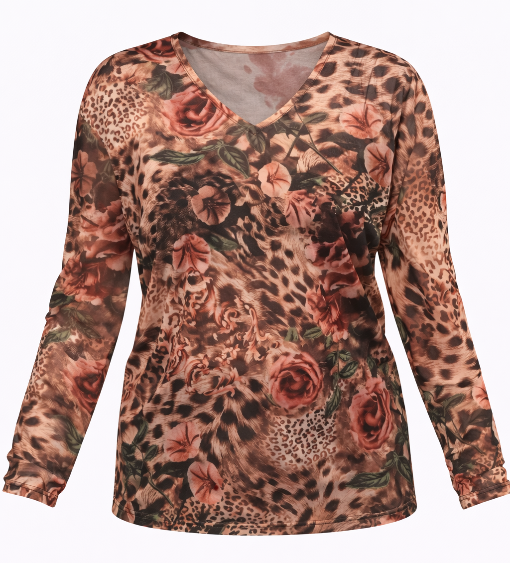 V NECK PRINTED MESH LONG SLEEVE TOP